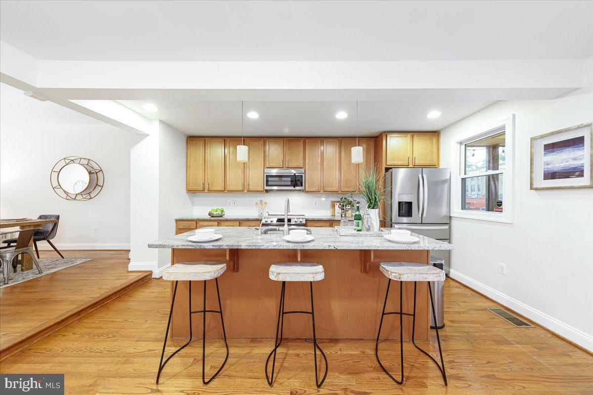 Welcome to this extra wide Wardman style home in the exciting Trinidad neighborhood. Its curb appeal is highlighted by an adorable front yard and covered porch. Wait until you see what awaits you inside! The main-level open floor plan with hardwood floors offers easy living. Distinct spaces define the living room and dining room. A large kitchen with granite countertops, stainless steel appliances, gas cooking, and huge island are just perfect. The screened-in porch off the kitchen has skylights and a swinging door to the backyard, a true gem, extending the home's living space and providing the perfect place for meals al fresco. There is also a half bathroom on the main level.