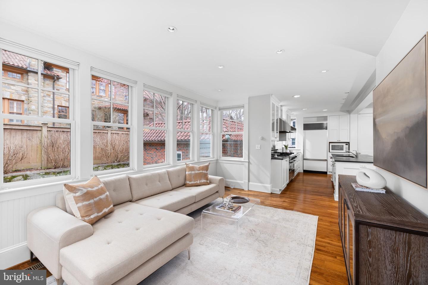 Grand and beautiful Chevy Chase, DC TREASURE - well located in neighborhood "sweet spot" easily walkable to shops/restaurants/transit on both Connecticut and Wisconsin Avenues. Expansive, airy interior of over 6,000 SF features large-scale rooms, tall ceilings, enchanting craftsman architectural details, and wonderful southern light throughout! Main level with 9' ceilings composed of elegant foyer, 30' living room with adjoining screened porch, large dining room, and spectacular open kitchen/family room with breakfast area and mud room with side entrance from garage/parking. Second level features 4-5 generous bedrooms including primary suite with en suite bath and walk-in closet. Third level accessed by low-riser stairs features bedroom, full bath, and HUGE attic space with two cedar closets - ideal for storage or expansion opportunity. Fully finished lower level features large rec room, bedroom with full bath, laundry/storage, and attached garage. Lovely level surrounding gardens with additional detached garage.